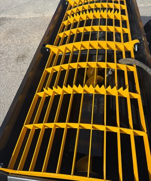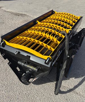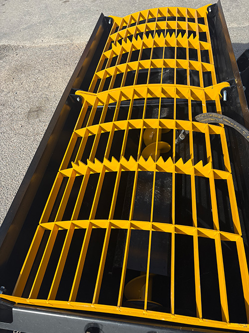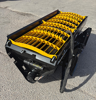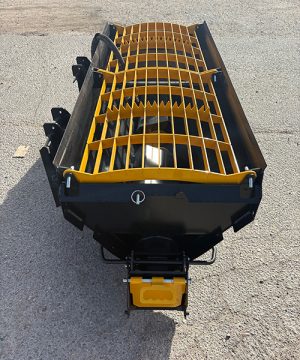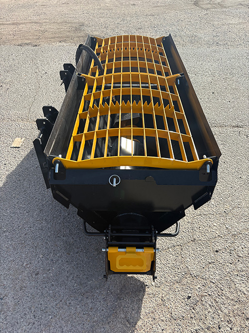 With adjustable mounting brackets and pallet fork tine slots on both sides, conveniently dispense left or right. Built-in cutting edges and a robust design make it well-suited for scooping from piles. Comes standard with dual safety grates, including integrated bag busters, that can be opened individually from either side.