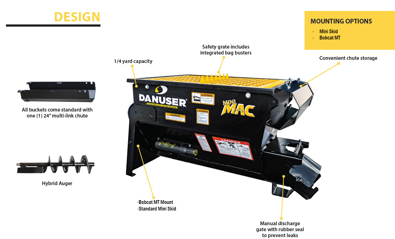 We’re excited to introduce the Danuser Mini MAC—a compact mixing & conveying bucket engineered for mini track/mini skid loaders. It replaces manual mixing and awkward wheelbarrow runs with fast, precise dispensing—ideal for tight work zones like backyards, basements, between buildings, and underground sites.
