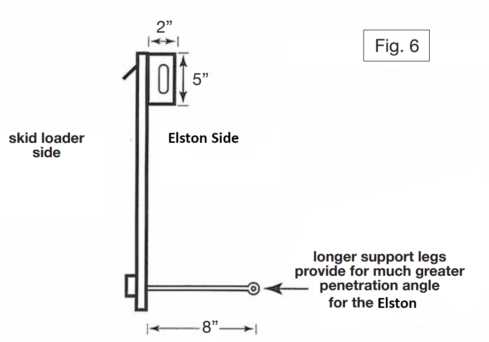 A skid-loader works great for ditch checks because the cylinders give it a large range of motion for different slopes. In cases where a skid-loader can not retract enough for the Elston to install in a head-on slope, an adapter plate engineered as shown is recommended to facilitate those situations. See Fig. 6 below.