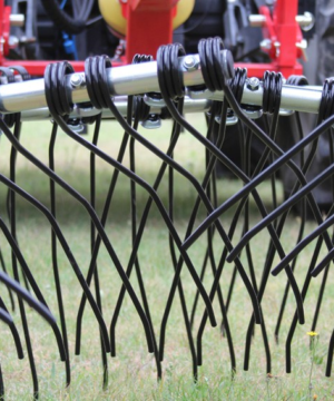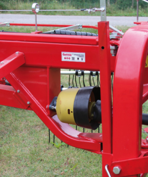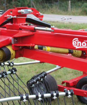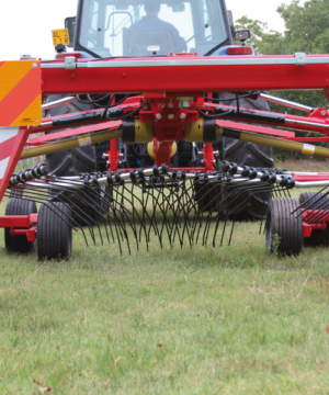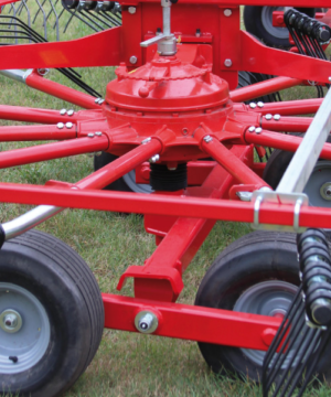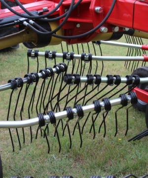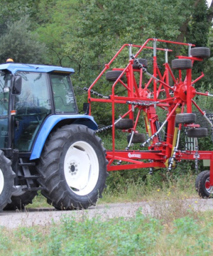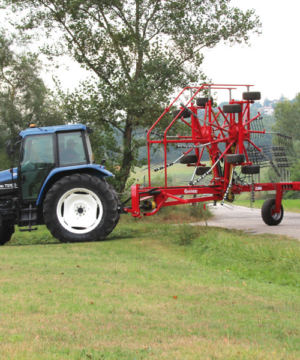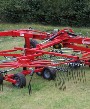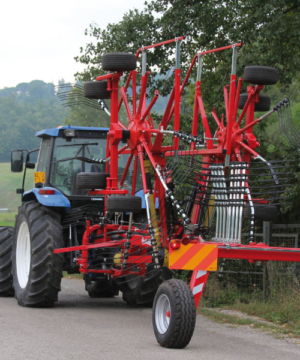 Semi-mounted rotary rake designed for large productions. At the minimum working position (7 m.) the arms cross over moving all the forage in the centre. Oil bath gearboxes. Cardan shaft with slip clutch. Both opening and closing movements and working width are hydraulically controlled from tractor cab. 2 wheels 10.075-15.3 and 8 wheels 18.850-8 mounted on tandem axles. Light kit included. By removing only 3 of the tine holder arms for rotor, the transport height is less than 4 mt. and you can easily change plot of land very fast.