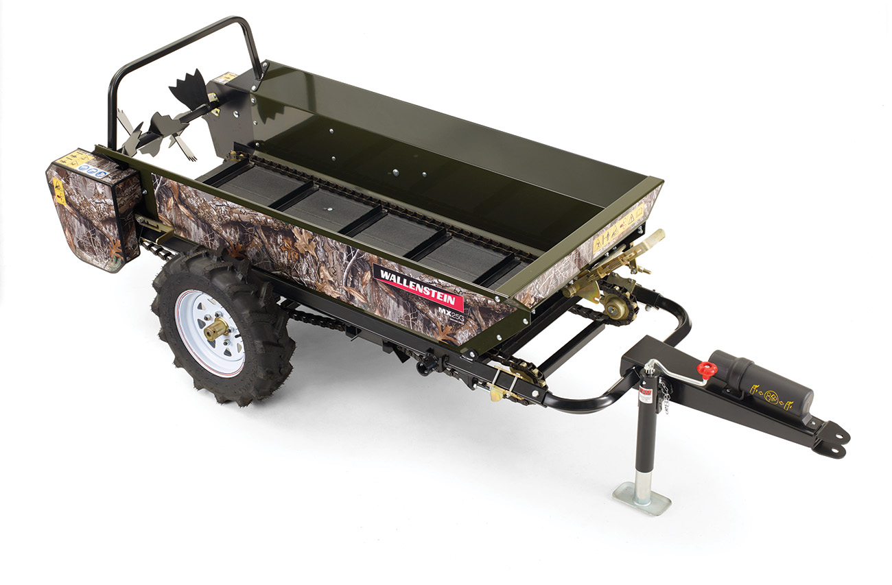 25 bushel capacity, the MX25G ground driven manure spreader offers simplicity and reliability with ATV’s, UTV’s or even lawn tractors. Traction implement tires are standard to ensure the torque is there for a fine, consistent spread.
